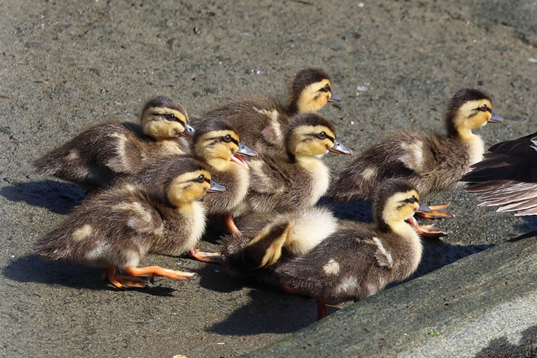 5/23に自宅の目の前にある“ふなだまり”という大きい池(水路で海とつながっています)に、9羽の雛と1羽の親の計10羽のカルガモ親子が現れました。