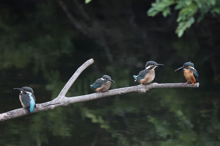 右端のお腹が鮮やかなオレンジ色しているのが親で、他の3羽が幼鳥です。