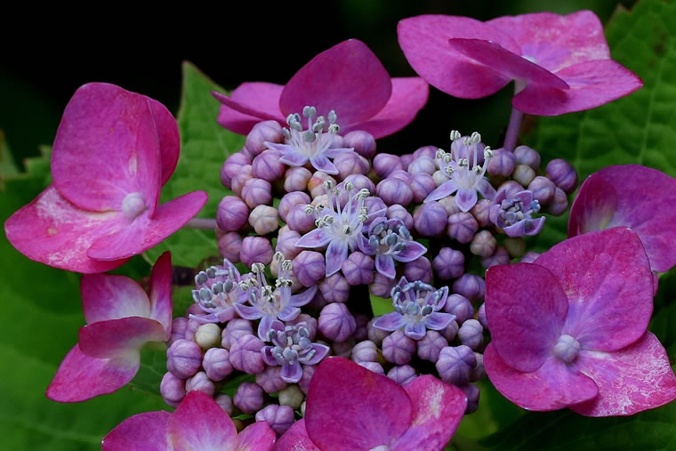 中心部は花序(かじょ)と呼ばれる小さな両性花が密集していて、周囲に装飾花(中性花)が咲いています。