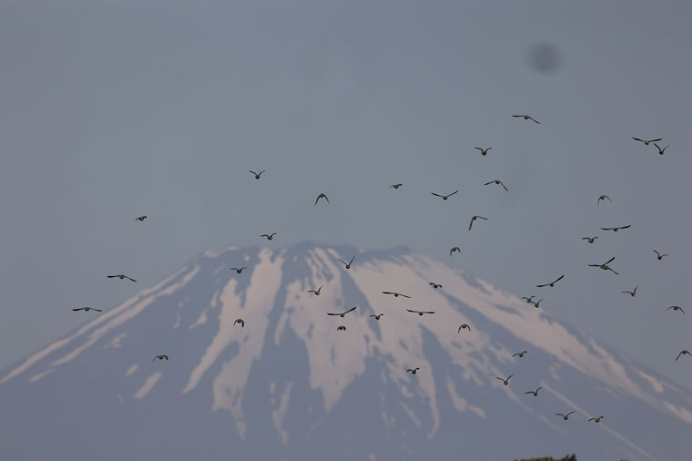 海水吸引の後、満足して帰路に着くアオバトを、 富士山をバックに撮れました。