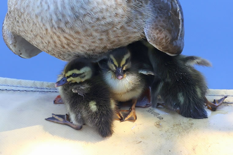 この日は強い日射しでしたので、オイルフェンスに上ると、すぐにお母さんの下に潜り込みます。