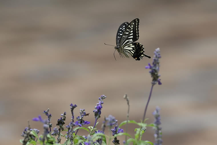 ブルービーを待っていたら、ブルーサルビアの近くをアゲハが飛び回っていました。
