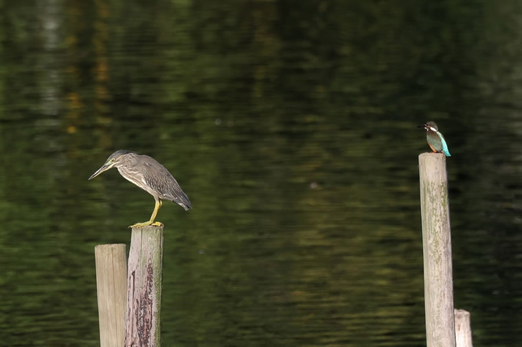 そのササゴイの横にカワセミが飛んできて、2羽が並んでくれました。