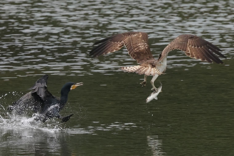 今まで、ミサゴに見向きもしなかった鵜が、ミサゴがゲットした魚を横取りしようと猛追してきました。