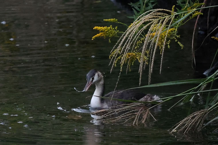 黄色の花のセイタカアワダチソウとススキの下にカンムリカイツブリが泳いできました。