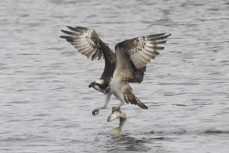 大きなボラを片足でつかんで、水面から飛び出しました。