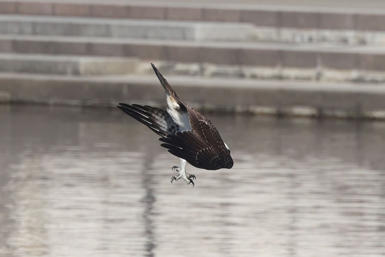 “ダーウィンポーズ”と呼ばれるポーズです(1枚目の写真も)。ミサゴが水面に飛び込む直前には両足を前に伸ばして、水中で魚を鋭い爪で捕獲します。