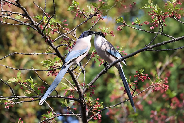 桜が咲き終わり、花ガラだけになった桜の枝に2羽のオナガが仲良く向かい合って止まりました。
