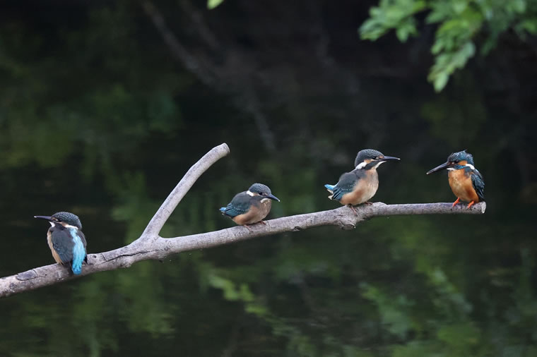 右端がお母さんカワセミ、他の3羽が幼鳥です。