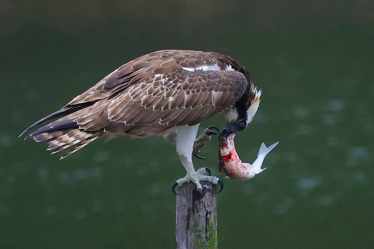 捕らえた獲物を足で掴んだまま、はるか上空を運び去ることが多いのですが、珍しく公園の中洲の杭の上でのお食事です。