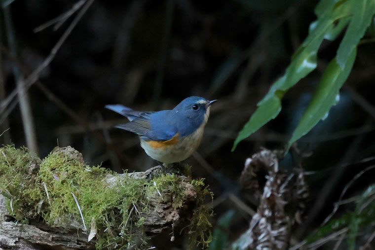 薄暗い森の中で日の光を浴びて瑠璃色に輝くルリビタキ。