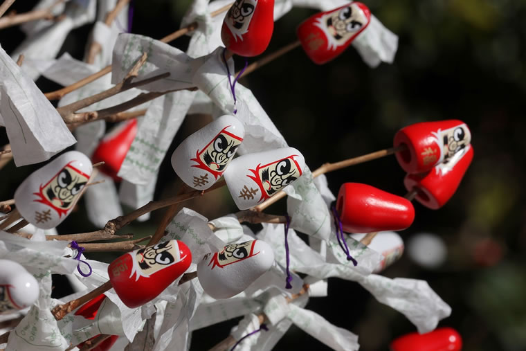 大きな木の枝に沢山のだるまが刺さっていて、おみくじが枝に結ばれていました。。