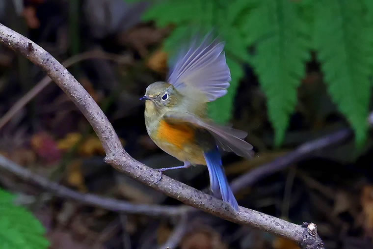 若オスは尾の青味が強く、脇のオレンジ色部は広く濃い色、翼角に青味があります。