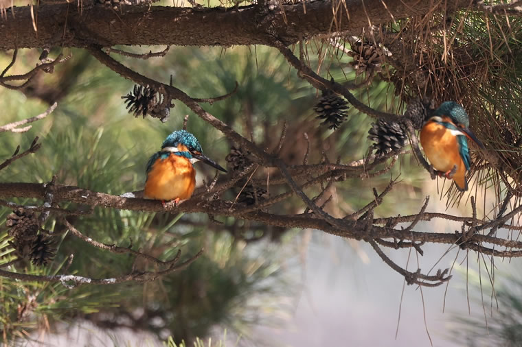 近くの松の木にカワセミのカップルが、しばらく水面を眺めていました。
