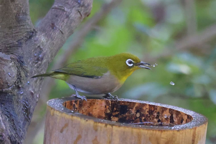 この水場にメジロがやってきて、水を飲んだり、水浴びをします。