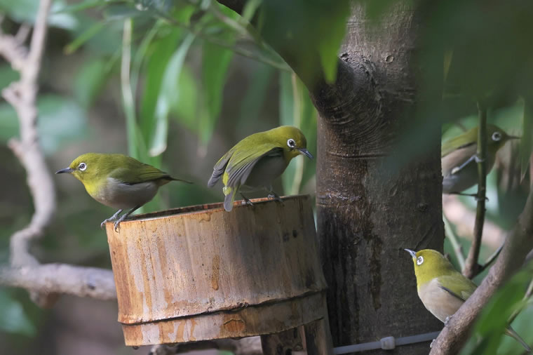 この写真は、先ほどまでの写真とは別の水場です。竹筒での水飲み、水浴びはせいぜい2羽なので、右下と右奥でメジロが順番待ちしています。