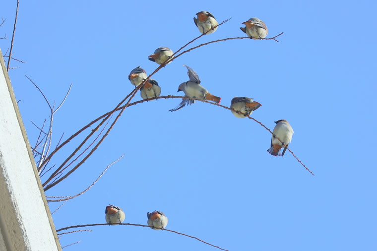 レンジャク(連雀) という名前は、樹木の枝に止まる際には、スズメ(雀)が連なって止まるようにして休むことから由来しているようです。