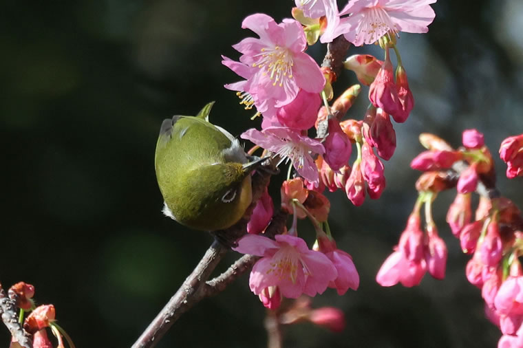 近所の野鳥観察公園の横浜緋桜が開花し、メジロが蜜を吸いに来ていました。