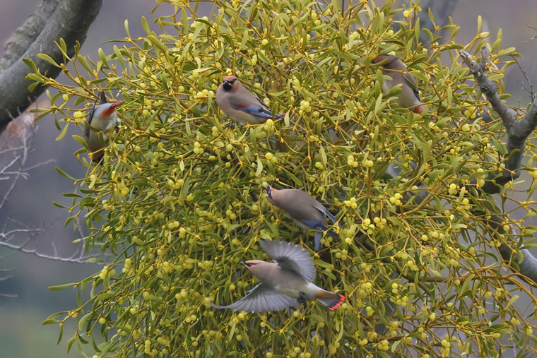 黄色い実を啄んでは、別のヤドリギの熟した実を求めて飛び回ります。