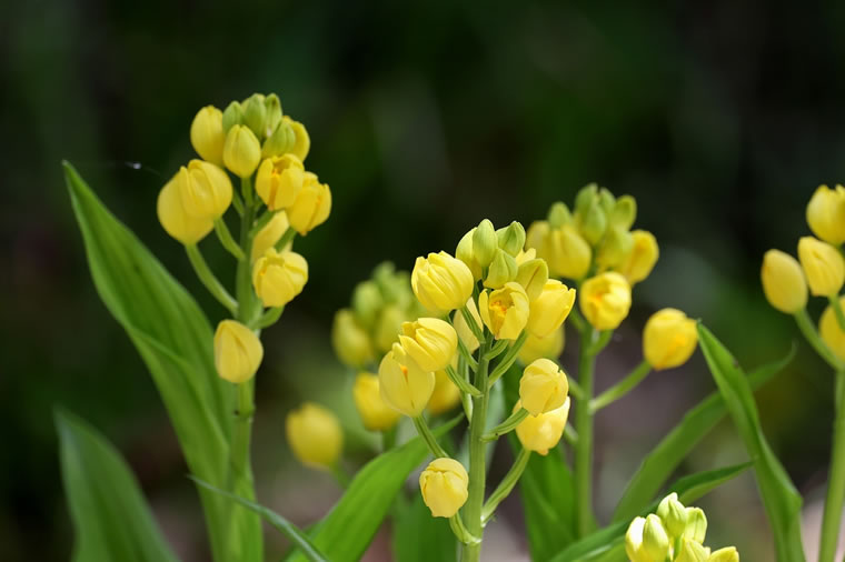 山や丘陵の林の中に生える地上性のランで、高さ30-70cmの茎の先端に4月から6月にかけて直径1cm程度の明るく鮮やかな黄色の花を総状につけますが、花は全開せず、半開き状態のままです。