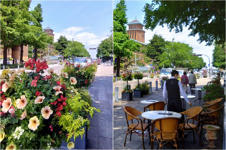 写真左 は日本大通り。写真右の左上の塔は、「横濱三塔」の一つ“キングの塔(神奈川県庁本庁舎)”です。