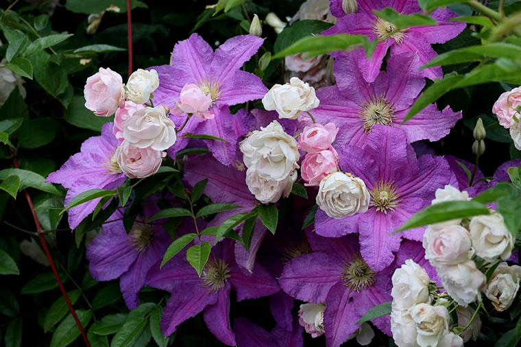バラ園の中では、青いクレマチスの花も目を惹きます。