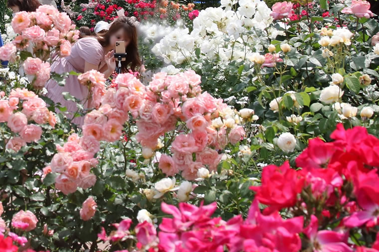 色とりどりの薔薇に囲まれて、素敵な女性がスマホ撮影中でした。