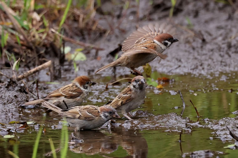 子スズメ3羽と、飛んできた親スズメです。