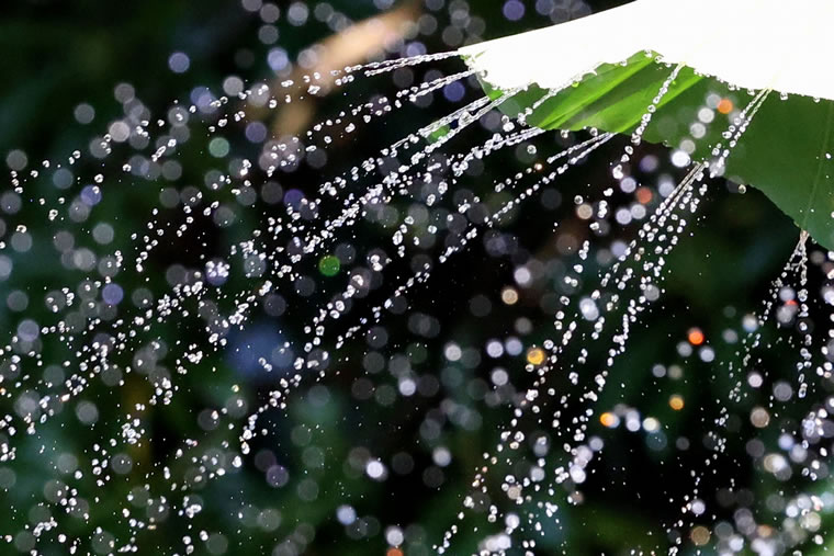 蓮の葉の周辺を切り取って、茎をホースにつなぐと、蓮の葉脈の水路でシャワーとなって水滴が飛び出します。