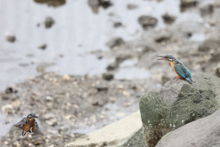 お母さんカワセミ(右上)の声に、子(左下)が飛んできました。
