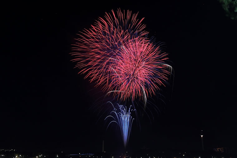 実際に目で見る花火は瞬間ですが、花火の写真は約10秒間の光景を重ね撮りします。