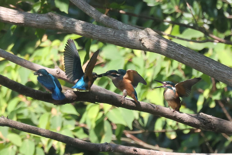 右から2番目の親カワセミが魚を咥えてくると、待ちかねていた幼鳥3羽が集まってきました。