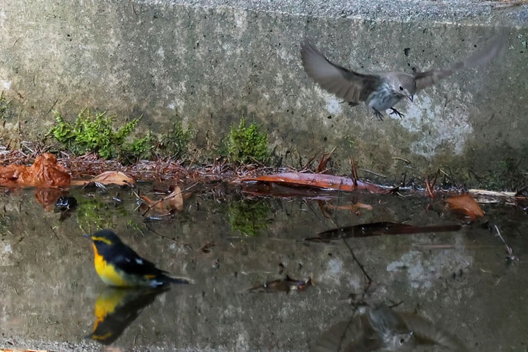 キビオス(鳥撮りカメラマンの間ではキビタキのオスをこう呼びます)が水浴びしているとエゾビタキがやってきました。