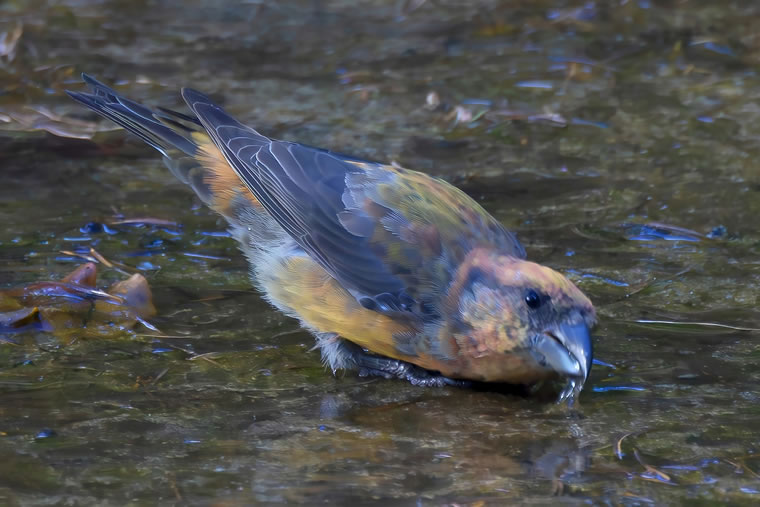 イスカのくちばしは左右互い違いになっており、このくちばしを使って、マツやモミなどの針葉樹の種子をついばんで食べます。