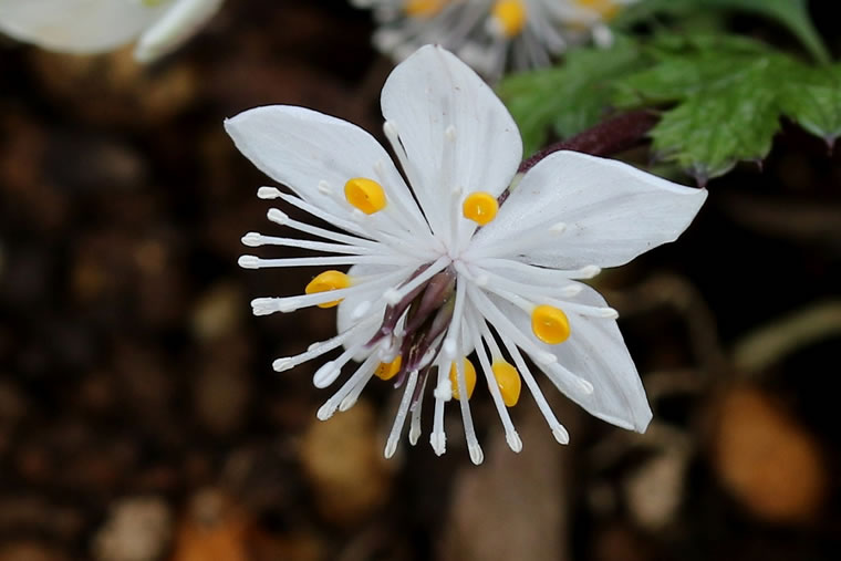 名前の由来は、花が梅の花に似ていることからバイカ(梅花)、根が黄色いのでオウレン(黄連)。