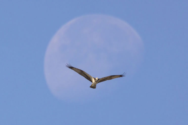 ミサゴが現れるのを待っていると、遠くから近づいてくるので、カメラを向けて待っていると、ちょうど月の中に入りました。