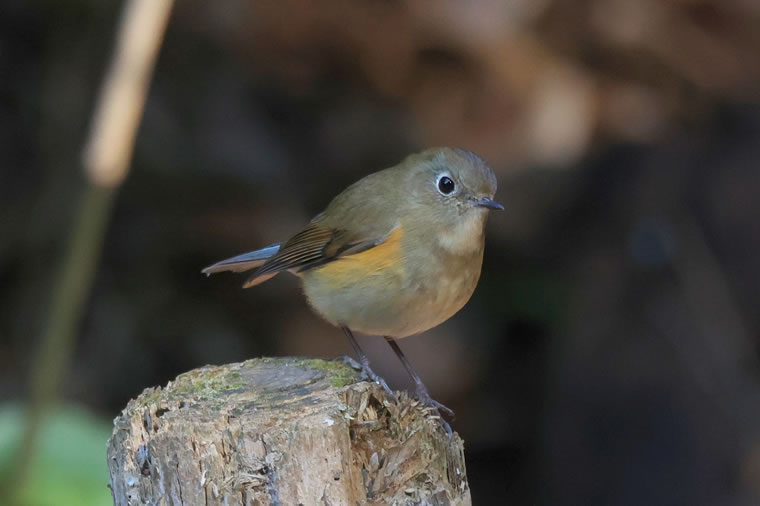 メスは全体的に緑褐色、脇の部分が黄色、わずかに尾が青色です。