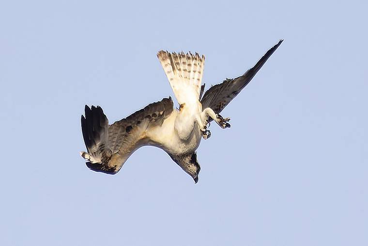 写真は、上空を旋回していたミサゴが獲物を見つけ、急降下する瞬間です。