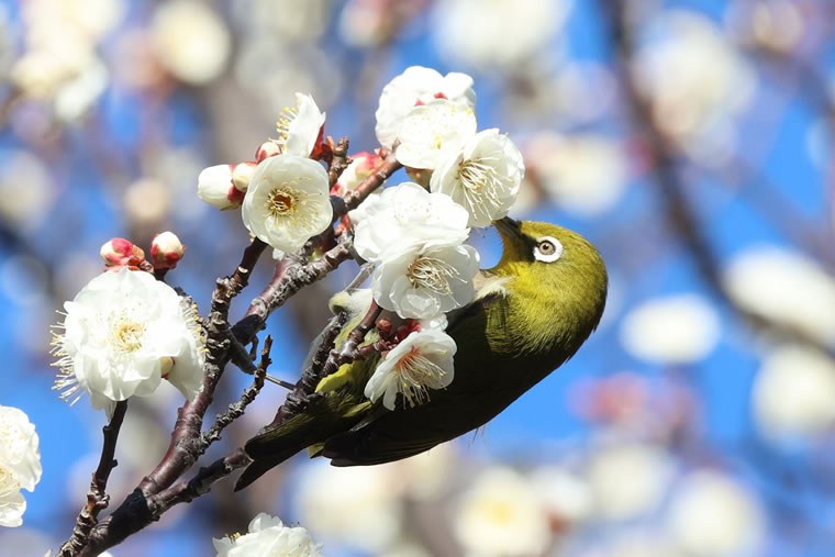 1月中旬なのに、白梅と紅梅が見事に咲いていて、メジロが数羽蜜を吸いに飛び回っているではありませんか!!
