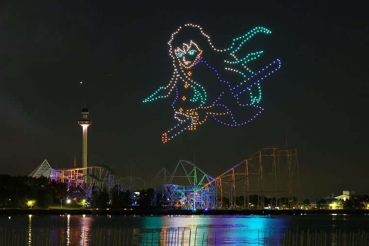 ドローンが描く映像の下には、八景島のジェットコースターのレール、展望タワーが光に青白く照らされ、海面に映る光も綺麗でした。