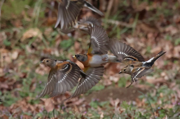 地面の実を食べ終え、数十羽のアトリが飛び出しました。