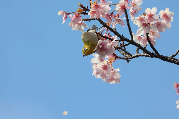 落ちていく花びら(写真の下)をメジロが眺めています。