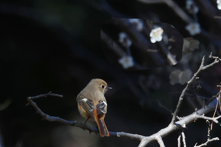 ジョウビタキ(メス)が咲き始めた梅の枝に止まっていました。