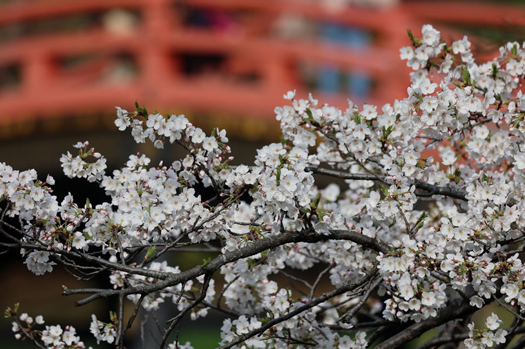 ソメイヨシノが朱色の橋をバックに鮮やかでした。