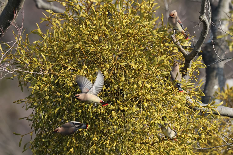 一つのヤドリギの実に5羽のヒレンジャクが集まっています。