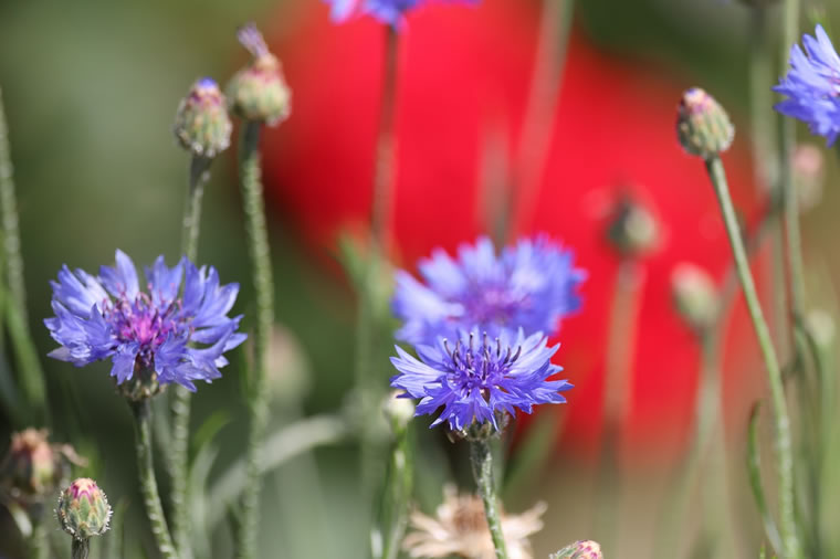多くの薔薇の一角で、咲いてした矢車草の青が鮮やかでした。