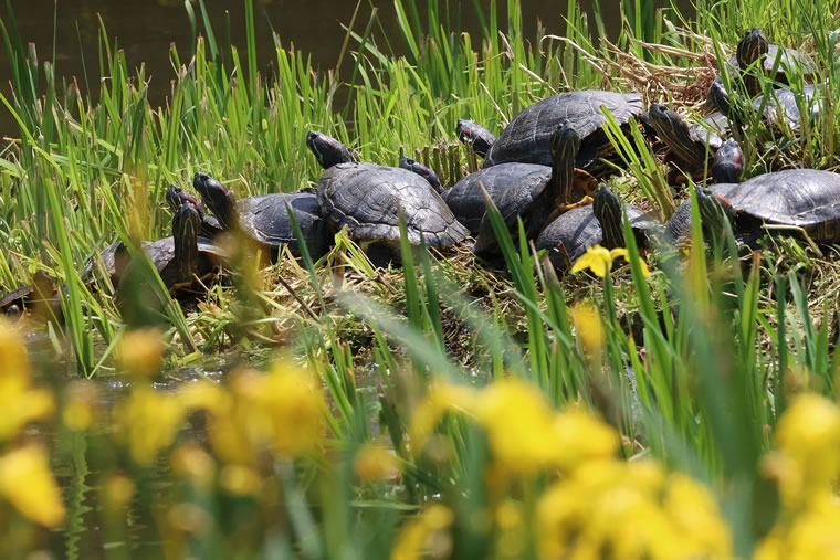 池の中央の小島には、亀が20匹以上、甲羅干しをしていて、この光景を見た人はその数の多さに驚いていました。