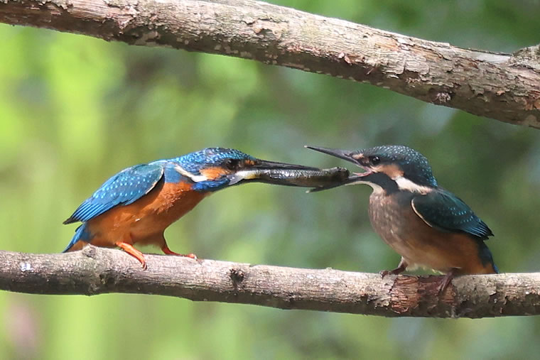 幼鳥(右)がお父さん(左)から小魚を受け取る瞬間です。