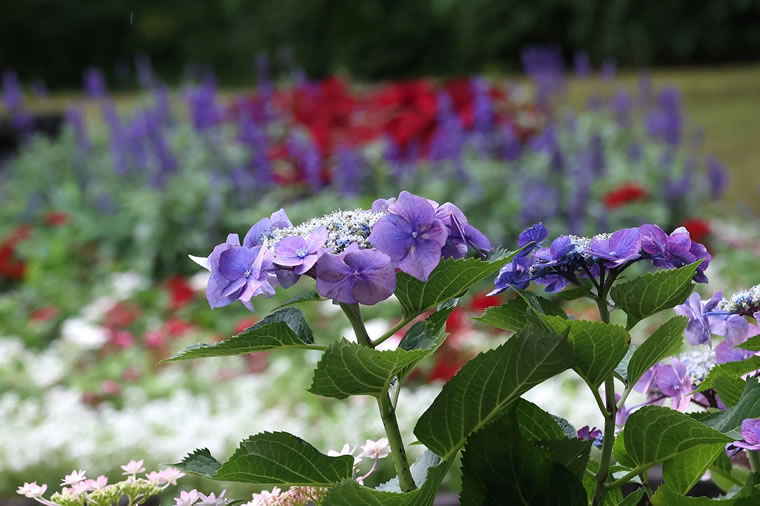 アジサイの背景の花壇では、ブルーサルビアなどが咲いていました。