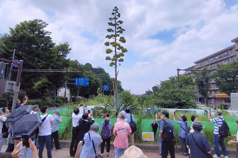 中央分離帯にそびえ立つ植物。40人ほどいて、スマートフォンやカメラを向けていました。
